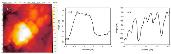 Through AFM measurements performed over an area of 2.5 µm2, the surface topography of the deposited ink was analyzed using the Gwyddion 2.62 software [37]. The deposited AgNPs reveal a sample surface with a roughness that is quite a bit greater than that of pristine photographic paper. As expected from our SEM investigation and in agreement with previous works [37,38], our results show several irregular and compact arrangements of the agglomerated AgNP-based ink over the whole sample surface. The mapped vertical and horizontal gray lines of Figure 6a scan a region of overlapped NPs. For the vertical scan, the maximum height profile is 470 nm, while the minimum height is 200 nm, as shown in Figure 6b. These particles are found to have well-defined diameters lower than 50 nm. The horizontal scan marked in Figure 6c shows the clustering of the AgNPs in a deeper region. According to the profile illustrated by the variations recorded in Figure 6c, the nanoparticles have diameters between 30 and 60 nm, which confirms both their relatively uniform spherical shape and their dimensions measured by SEM.
