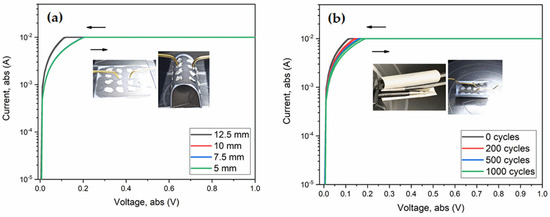 Current-to-voltage measurements were performed with forward and reverse sweeps in order to evidence possible hysteresis effects related to material degradation and memory effects (such as charge–discharge mechanisms) after successive flexions and bending cycles. All the parameters and data recorded for this set of experiments are summarized in Table 1. A regular, symmetric, and reproducible behavior, compatible with the one expected for ohmic contacts, is shown in Figure 7. Here, the apparent saturation observed above 0.1 V results from the equipment limitation. A nominal resistance of 11.74 Ω is measured when the flexible substrate is flat, and the resistance increases up to 17.99 Ω when it is brought to a bending radius curvature of 12.5 mm, as shown in the inset of Figure 7a. After successive bending cycles, it was found that the resistance increases and stabilizes at around 20 Ω for radius curvatures decreasing from 10 mm to 5 mm. Despite the enhancement of the bending curvature, the ohmic nature, as well as the resistance of the conductive wire, were not significantly affected.