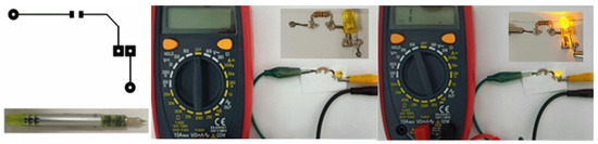 To illustrate an example of practical applications, AgNP-based ink was loaded inside a fountain pen and used to trace a pattern by handwriting on the photographic paper. As illustrated in the pictures presented in the inset of Figure 8, the electrical circuit achieved through this very simple method is powering an LED when connected to an external voltage source of 9 V. The LED was successively turned on and off, demonstrating efficient current conduction. Despite being a very basic demonstration of ink functionality, this kind of prototype shows the capabilities of incorporating AgNPs into liquid solutions for printing electronic components or facilitating the replacement of damaged PCB boards. These functional inks could also be implemented to achieve a great variety of flexible devices, spanning from health monitoring systems to energy converters. Both the reduced size and weight of these advanced devices make them more particularly relevant for applications in aerospace [47], packaging [48,49], health [50], and biodegradable electronics [51,52].