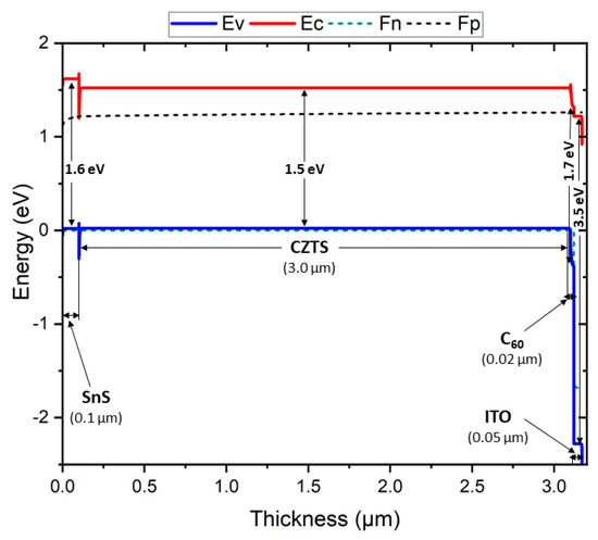 Energy band diagram of the proposed heterostructure cell—ITO/C60/CZTS/SnS.