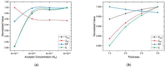 Normalized values of solar cell output parameters as a function of (a) acceptor concentration and (b) thickness.
