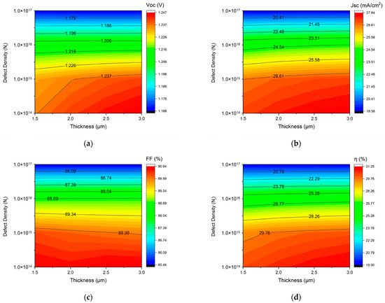 Imperfections in a realistic active material are caused by dislocations and grain boundaries. These flaws act as carrier recombination centers, reducing the carrier lifetime and mobility. Figure 5 displays the combined effect of the defect density and absorber layer thickness on the solar cell performance to evaluate the device’s performance. The influence of the defect density between 1 × 1014 cm−3 and 1 × 1017 cm−3 and the thickness between 1.5 and 3.0 μm is explored in this study. Figure 5 illustrates how VOC fluctuates slightly with the thickness at a defect level below 1 × 1015 cm−3, where a regular variation in the defect density is noted. When the acceptor concentration is lower, VOC indicates its highest output; however, as the thickness increases, it also increases the value of VOC. The reducing behavior of JSC is quite similar to that of VOC. However, JSC reaches higher values when the thickness drops between 2.5 μm and 3.0 μm, and this value is affected by an increase in defects. Additionally, FF and η mostly follow the JSC and VOC outputs. The efficiency is roughly the same as the short-circuit current, although the fill factor is larger at moderate thickness values. When the defect density in the absorber layer surpasses 1 × 1016 cm−3, the cell performance deteriorates significantly. This decline is likely due to an increase in trap-assisted carrier recombination, as illustrated in the figure. The power conversion efficiency (PCE) decreases from 31.21% to 19.31%. According to this research, Shockley–Read–Hall (SRH) recombination significantly affects the loss of cell efficiency when the absorber layer contains many defects. This process involves carrier recombination in semiconductors through defect states within the bandgap. Such defects, often resulting from impurities or structural imperfections, can capture and recombine charge carriers (electrons and holes), thus lowering the overall efficiency of the semiconductor device. After combining these, we discovered that this absorber layer, with a greater thickness, can address the issue of lower outcomes, as shown at the above concentration. This can therefore continue to be increased because this range of thicknesses does not affect the experimental work.