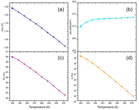 Effect of temperature on solar cell performance parameters: (a) open-circuit voltage (VOC), (b) short-circuit current (JSC), (c) fill factor (FF), and (d) efficiency (η%).