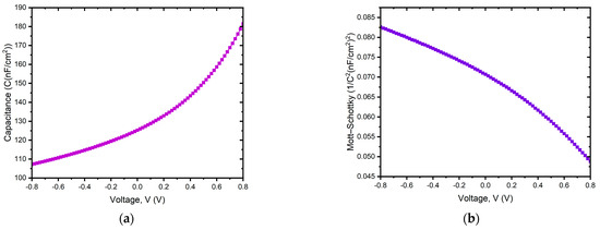 Figure 8a,b illustrates the capacitance per unit area (C) and the Mott–Schottky (M–S) plot as functions of the bias voltage (V), respectively. From these C–V measurements, the built-in voltage (Vbi) and charge carrier density (Nd) can be derived using the established M–S analysis method. This technique is traditionally applied to semiconductor devices with fixed depletion layers and space charge regions, such as those with p–n junctions or semiconductor/metal interfaces. Equation (5) provides the value of the junction capacitance per unit area (C).