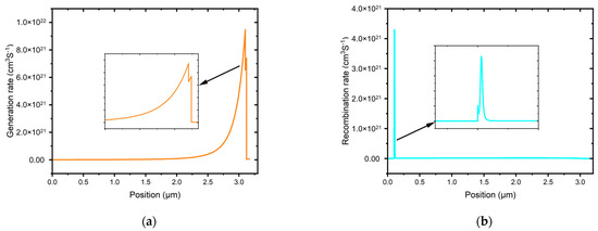 Recombination is the reverse of generation, where electrons and holes from the conduction band pair up and are annihilated. The recombination rate in a solar cell is influenced by the charge carrier’s lifespan and density. Initially, electron–hole recombination is reduced due to defect states within the absorber layer. These defect states create energy levels that affect the electron–hole recombination profile within the solar cell structure. Consequently, the recombination rate distribution is non-uniform, as indicated in Figure 9b, due to imperfections and grain boundaries.