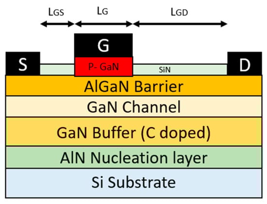 DUTs were 100 V AlGaN/GaN HEMTs grown on silicon substrate. Normally off operation was obtained by means of a Schottky p-GaN gate structure, while the GaN buffer was carbon (C) doped to obtain a semi-insulating layer []. The gate width (WG) was 0.4 mm, while the gate length (LG) was <1 µm. The gate-source (LGS) and gate-drain (LGD) distance were <1 µm and <2 µm, respectively (see Figure 1). Prior to AlGaN surface passivation, two plasma-based surface treatments with different recipes were considered, namely Type A and Type B, whose details cannot be disclosed due to confidentiality reasons.