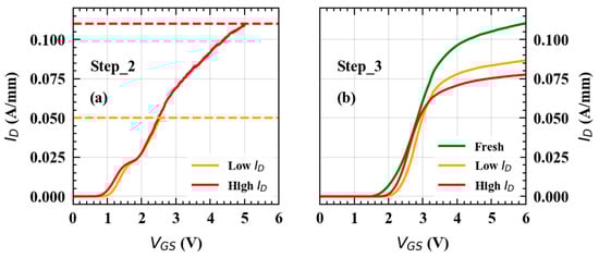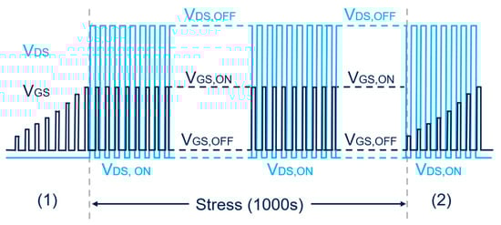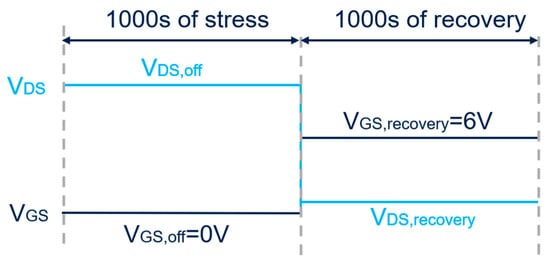 Before starting the stress phase (1), the fresh ID-VGS characteristic was reconstructed by means of a sequence of gate pulses (2 μs) ranging from 0 V and 6 V, while the device’s VDS was at VDS,on = 0.5 V. Then, a 1000 s stress was performed at VDS = VDS,off, VGS,off = 0 V. During the stress, the device was periodically turned on with a 100 µs switching period and 2% duty cycle to mimic conventional switch mode operation. After the stress (2), the gate voltage was pulsed again to capture the stressed ID-VGS characteristics. At the same time, the drain voltage was briefly pulsed to VDS = VDS,on with short (2 µs) on-state time intervals separated by 100 µs off-state biasing. During this off-state time, the stress voltage (VDS,off) was still applied to the DUT, to reduce the parameters recovery.