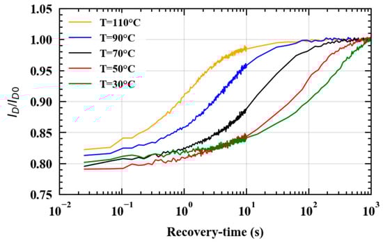 Typical ID/ID0 recovery transients acquired on Type A device after 1000 s stress at different temperatures (30 °C, 50 °C, 70 °C, 90 °C, 110 °C). The drain current completely recovered in 1000 s with an exponential-like trend that sped up while increasing the base-plate temperature.