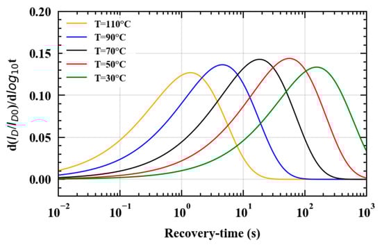 d(ID/ID0)/dlog10t signals extracted from the ID/ID0 recovery transients in order to extract the process time constant for each temperature in correspondence to the derivative peak.