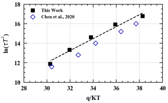 The emission time constant extracted was then used to reconstruct the Arrhenius plot shown in Figure 5, according to the logarithmic form of the Arrhenius equation []. To verify the involvement of buffer traps, the Arrhenius plot obtained in this work was compared to the one reported in a previous paper in which the trapping/de-trapping mechanism was associated with the ionization of carbon-related acceptors in the buffer layer [].
