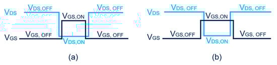 Waveforms corresponding to (a) soft-switching mode (i.e., in which the DUT is turned ON/OFF ant 0 V drain voltage) and (b) hard-switching mode (i.e., in which the DUT is turned ON/OFF at VDS = VDS,off).