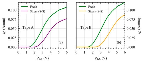 Comparison between ID-VGS characteristics obtained on fresh devices and after 1000 s stress at VGS,off = 0 V and VDS,off = 50 V under soft-switching (SS) mode for both (a) Type A and (b) Type B devices.