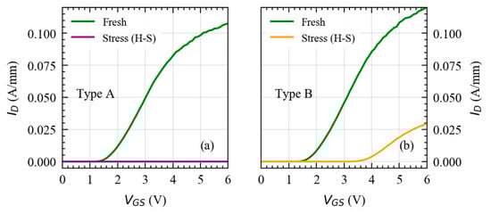 Comparison between ID-VGS characteristics obtained on fresh devices and after 1000 s stress at VGS,off = 0 V and VDS,off = 50 V under hard-switching (HS) mode for both (a) Type A and (b) Type B devices.
