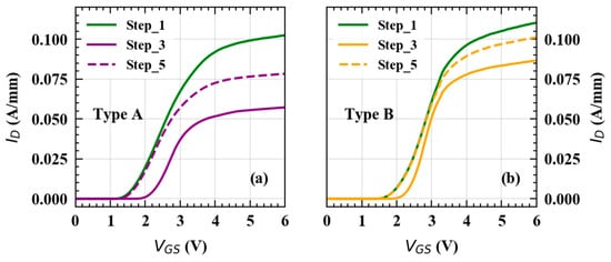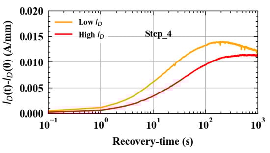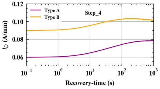 The device featuring Type A treatment showed an evident current collapse after the application of the on-state stress (see Step 3 in Figure 12a). On the other hand, the ID-VGS curve acquired after stress for treatment B showed reduced parameter degradation, consistent with the behavior captured by PIV measurements. This evidence suggests that part of the degradation could be associated with surface traps. This is further confirmed by a reduced degradation retained after 1000 s recovery for Type B devices, stemming for the presence of an optimized surface (see Figure 12b). As highlighted previously, this retained degradation affects only the device’s RON, whereas the device’s VTH is completely recovered. This indicates that the retained current reduction after 1000 s is due to the trapping effect that takes place in the access regions. Another important aspect refers to the ID recovery transient monitored during Step 4. In fact, the ID recovery transients obtained for the two different surface treatments showed similar time constants and amplitudes (see Figure 13).