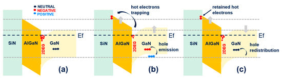 During Step 1, the fresh ID-VGS characteristic is acquired and the 2DEG is formed at the AlGaN/GaN interface. C-related acceptor traps are at equilibrium and are neutral (see Figure 14a). During Step 2, the applied on-state stress yields the trapping of hot electrons at the device’s surface (i.e., at the AlGaN/SiN interface). At the same time, hot carriers favor the ionization of C-related acceptors that become negatively charged by emitting holes in the valence band. The increased negative charge at both surface and buffer layer causes the partial depletion of the 2DEG due to an upward shift of the bands (see Figure 14b). During 1000 s recovery time (Step 4), holes redistribute in the buffer and are trapped back in their previously ionized acceptor states. Accordingly, during Step 5, C-related acceptors in the buffer are neutralized and partially repopulate the 2DEG. The retained hot electrons at the surface, conversely, are still present during Step 5 and yield a not completely recovered 2DEG density (see Figure 14c). This causes a not completely recovered RON.