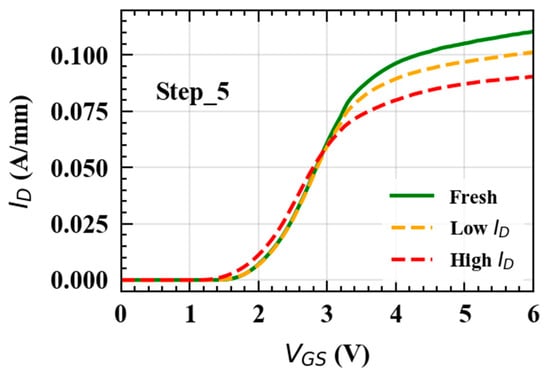 - A fresh ID-VGS curve of the DUT was measured to set a reference value for the device’s parameters. To this end, VDS was kept at 0.5 V, while VGS was swept from 0 V to 6 V to extract VTH and RON;