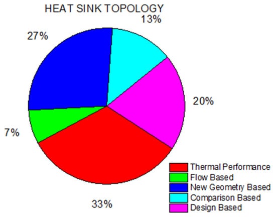 The arrangement or design of heat sinks within a thermal management system is referred to as heat sink topology in Figure 2. Here, the pie chart’s sections are divided into distinct categories. The term flow-based refers to heat sink topologies that optimize the passage of the cooling medium. The thermal performance-based category includes heat sink topologies created to maximize thermal performance and heat dissipation using materials with more conductive ability. Heat sink topologies that make use of special geometries to produce effective cooling are represented by the new geometry-based topology. The comparison-based section indicates a portion of the pie chart that compares or analyzes different heat sink topologies based on various factors, such as cost-effectiveness, thermal efficiency, or ease of implementation. The design-based section includes heat sink topologies that are determined by certain design factors, such as space limitations or system or device compatibility.