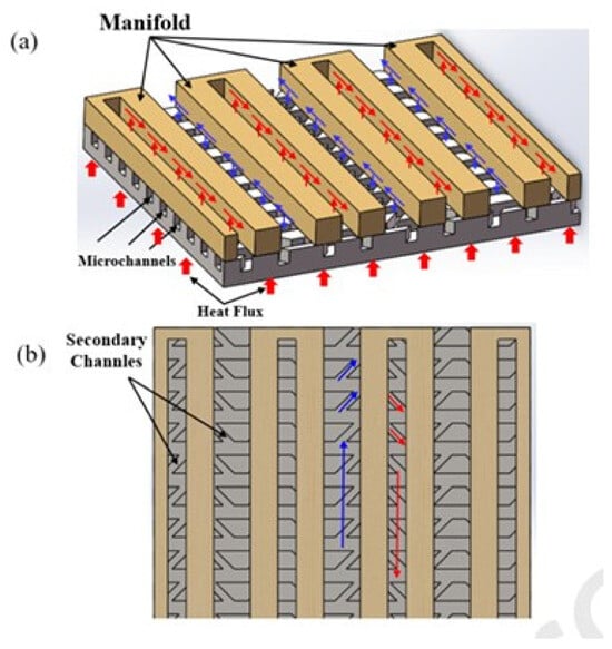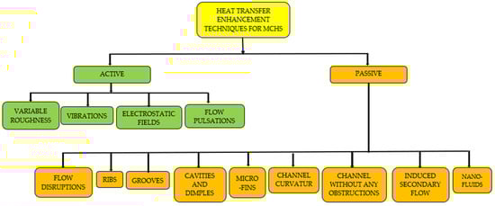 As the heat flux removal requirements for MCHSs rise, several strategies are developed to improve the MCHS’s capability of dissipating more heat effectively. These methods can be divided into two categories: active methods and passive methods []. Figure 5 illustrates the details of these strategies.