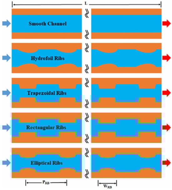 One common method of flow interruption on MCHS walls is the insertion of ribs. On the channel side walls, the small projections known as ribs can be positioned in several configurations, including parallel or staggered patterns. The flow turbulences created by these ribs reduce the heat of the thermal boundary layer and raise the heat transfer coefficient. Julian Wang et al. [] investigated the influence of microscale ribs and grooves on the heat flux rate. They observed that, in comparison to a smooth microchannel, the Nusselt number is increased by 1.1–1.55 times when ribs and grooves are added to the microchannel. The friction factor for a rib-grooved microchannel with compared rib heights of 0.6, 0.73, and 0.85 is more than 0.38 times, 2.16 times, and 4.09 times higher than the smooth microchannel, respectively, according to their investigation into the impact of altering the relative rib height on the friction factor. Xia et al. [] studied the effect of arc-shaped grooves and ribs on the thermohydraulic properties of a microchannel. Statistical methods were utilized in conjunction with the two target functions and the design elements of relative groove altitude, relative rib height, and relative rib width to reduce thermal resistance and pumping power at a fixed volume flow rate. It was found that relative rib height showed the highest performance, with overall thermal resistance decreasing linearly as rib height increased. The impacts of various cylindrical ribs and cavities were studied on the thermal and flow characteristics of MCHSs by Faraz Ahmad et al. []. For rib spacing (Sr) = 0.4 mm, the side wall ribs had the maximum thermal enhancement factor of 0.98, while the base wall ribs had the lowest thermal enhancement factor of 0.90. The all wall rib arrangement achieved a Nusselt number of 12.58, which is 71% higher than the Nusselt number of 7.35 for the smooth MCHS.