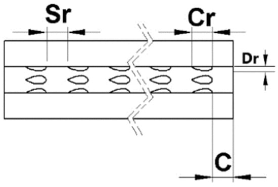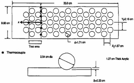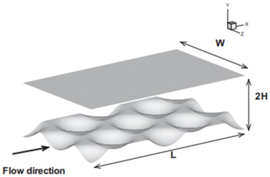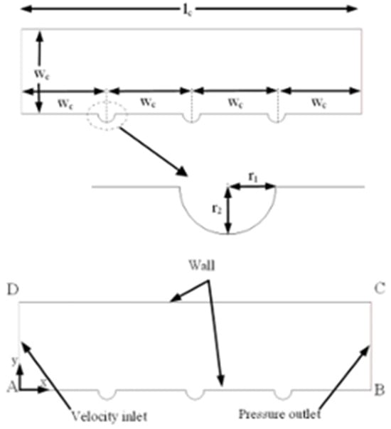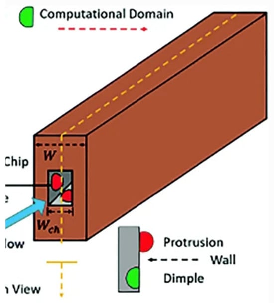 A microchannel with turbulent flow over a dimpled surface was experimentally studied by Moon et al. []. The thermochromic liquid crystal (TLC) technique was used to evaluate the local heat transfer coefficient. The channel heights of 0.37, 0.74, 1.11, and 1.49 were examined in a range of Reynolds numbers from 12,000 to 60,000. The Nusselt number of dimpled walls is 2.1 times that of a conventional channel, yet the friction factor is only 1.6 to 2.0 times that of a conventional channel in a thermally developed area. S. Gururatana [] investigated a microchannel heat sink (MCHS) with dimples and found that the dimples have a significant impact when the Reynolds number exceeds 125. Specifically, when the Reynolds number increases from 100 to 300, the pressure drop rises from 0.1 to 0.4, while the heat transfer increases from 0.2 to 0.26. Heat transfer is enhanced by the turbulence generated by dimples and cavities. In this section, different studies are summarized, which include the effects of dimples at different Reynolds numbers, dimples with varying aspect ratios [], turbulent flow channels [], thermochromic liquid crystal (TLC) technology to analyze dimples and cavities [], and varying channel heights. Heat transmission rises in response to an increase in Reynolds number []. Table 3 gives additional information for cavities and dimples as a flow disruption technique. Explanation of computational domains is shown in Figure 21, Figure 22, Figure 23, Figure 24 and Figure 25.