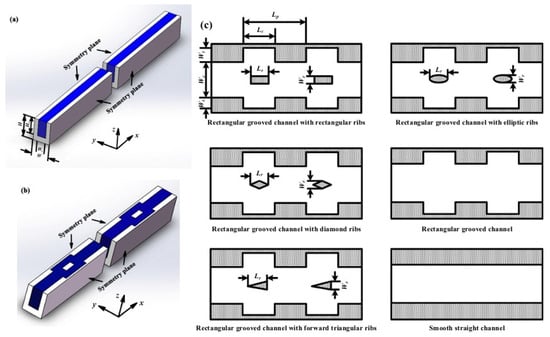- Zhu, Q.; Chang, K.; Chen, J.; Zhang, X.; Xia, H.; Zhang, H.; Wang, H.; Li, H.; Jin, Y. Characteristics of heat transfer and fluid flow in microchannel heat sinks with rectangular grooves and different shaped ribs. Alex. Eng. J. 2020, 59, 4593–4609. [Google Scholar] [CrossRef]