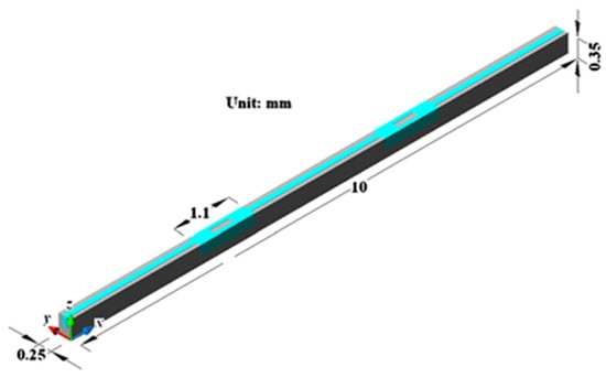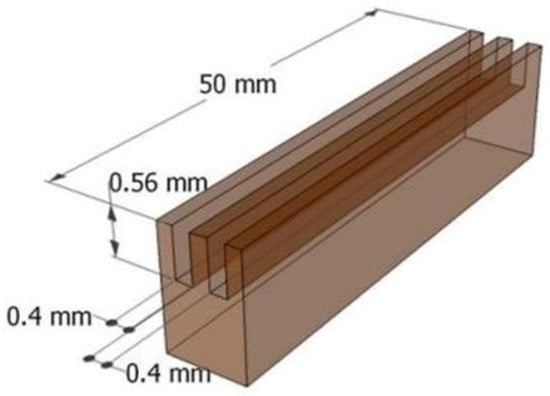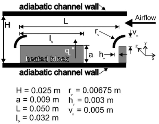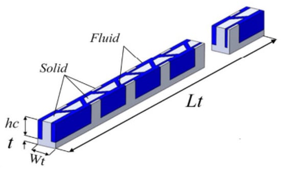 Active methods increase the thermal efficiency of smooth rectangular MCHSs by utilizing outside energy sources []. Go JS et al. [] investigated the effects of vibration induced by flow on thermal performance in 2003 in a micro fin array. They reported that a larger heat exchange rate was achieved through raising the micro fin’s vibration displacement because of vibration-induced chaotic convection. They compared the thermal performance based on the thermal resistance encountered in plain wall and micro fin array heat sinks. The evaluated heat transfer rate was found to be an increase of 5.5 and 11.5% at air velocities of 4.4 and 5.5 m/s, respectively. Hessami et al. [] investigated the impact of the flow pulsation technique on smooth MCHS performance. Their research revealed that raising the frequency and decreasing the intensity of flow pulsation led to improved heat removal.