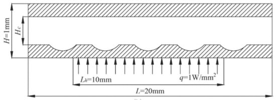 A wavy microchannel heat sink within the range of Reynolds numbers from 100 to 1000 was investigated using the finite volume method (FVM) by Deng, B et al. []. The amplitudes of the wavy microchannel ranged from 125 to 500 μm. The results showed that wavy microchannels outperform straight microchannels with the same cross-section in terms of heat transmission. The improvement in heat transmission outweighs the pressure drop penalty resulting from the wavy microchannels. The amplitude of the wavy microchannel grows as heat transport occurs. Except for microchannels with a wavy amplitude of 0.25, all the wavy microchannels had a better performance than traditional rectangular microchannels. The impact of geometrical factors on heat transport in microchannels for Reynolds numbers 100–1000 was investigated numerically by Gunnasegaran P. et al. []. A step MCHS was the best channel for the highest hydraulic performance, while a zigzag MCHS was the best channel for the highest thermal performance when compared to conventional straight MCHSs. Converging–diverging microchannels were examined by H. Ghaedamini et al. [], who found that converging–diverging microchannels improved the performance factor by 0.8, 1.0, and 1.2 at Reynolds numbers of 200, 400, and 600, respectively, compared to conventional microchannels. X. F. Peng et al. [] experimentally studied rectangular microchannels with hydraulic diameters of 0.133–0.367 mm and a height to width ratio H/W = 0.333–1. Laminar heat transfer took place at Reynolds numbers 200–700, whereas fully turbulent convective heat transfer formed at Reynolds numbers 400–1500. It was observed that geometric parameters greatly influenced the heat transfer and fluid flow. Laminar convective heat transmission occurred when the aspect ratio was close to 0.75, but turbulent heat transfer functioned best between 0.5–0.75. A tree-shaped microchannel net was numerically investigated by Xiang-Qi Wang et al. []. The pressure drop and uneven temperature difference in a typical microchannel led to the conduct of this investigation. According to the findings, these channel networks outperform traditional parallel channel nets in a number of areas, such as having a more consistent and lower temperature distribution and greater stability when a channel segment becomes accidentally blocked.