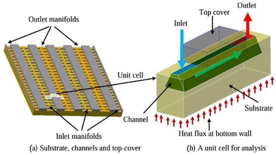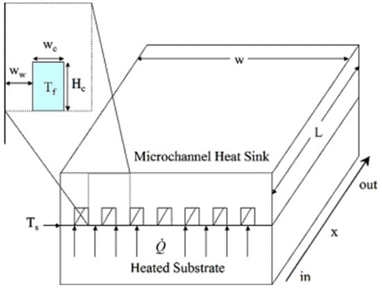 Due to a lack of heat dissipation, this high heat flux develops hotspots in chips, which present a great threat to the safety of the microchip itself and reduce its life span. Thus, thermal management is a crucial aspect for designers to ensure the safe operation of these microchips for a longer duration []. Also, with the size of mechanical and electrical components changing from micrometers to nanometers, the efficient and sustainable cooling of these components is essential to ensure the seamless function of these microsystems. For the better and optimum functioning of microsystems, advanced cooling systems have been developed that are more effective than conventional cooling technologies. The rapid development in MEMS technology has inspired researchers to design novel cooling systems that dissipate more heat efficiently compared to conventional cooling systems []. As the miniaturization and power density of electronic devices have increased, cooling systems have evolved from fan cooling to more extensive heat transfer processors to withstand severe heat fluxes []. Several methods have been studied and developed, including microjet impingement, micro heat pipes, micro-electrohydrodynamics, and MCHSs. Among all these cooling methods, MCHSs are best for removing flux from microchips [,].