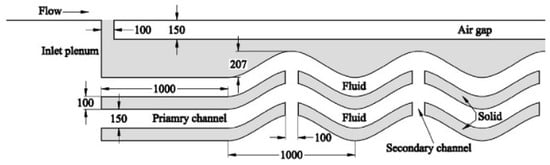 A trapezoidal microchannel of different aspect ratios for fully developed, single-phase laminar flow without slip circumstances was quantitatively studied by John P. Mchale et al. []. A numerical setup was used for a silicon MCHS and an experimental setup was used for a polycarbonate–Al MCHS; 45 degrees and 54.7 degrees were selected as the side wall angles. The research presents the local and average Nusselt numbers as a function of dimensionless length and aspect ratio. It was investigated how the Prandtl number affects the thermal admission condition. The fully formed friction factors were calculated and linked as a function of the channel aspect ratio. The fluid moving over a curved channel faces centrifugal forces, which might increase the fluid velocity near the outside walls of the channel. The total transfer of heat capabilities of the heat sinks are improved by this increased velocity, leading to improved heat transfer between the fluid and the channel walls. The surface area for heat transfer is increased by surface roughness [] and wavy microchannel heat sinks [], which results in greater heat transmission. Explanation of computational domains is shown in Figure 26, Figure 27, Figure 28, Figure 29 and Figure 30. Table 5 shows more information on the channel curvature described above.