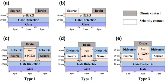 Schematic of (a) a-IGZO TFT, (b) a-IGZO SGT, (c) type 1 wrapping a-IGZO transistor, (d) type 2 wrapping a-IGZO transistor, and (e) type 3 wrapping a-IGZO transistor.