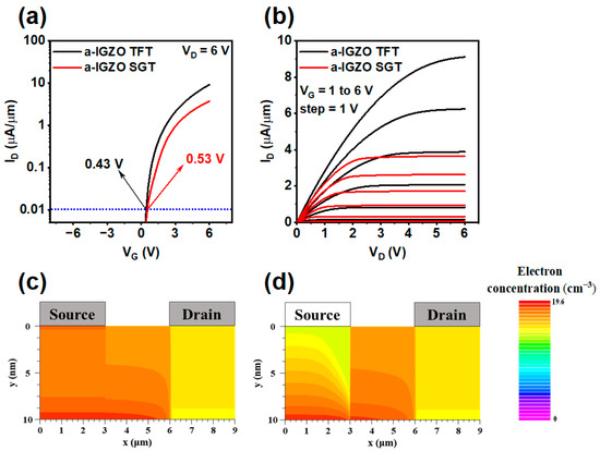 (a) Transfer characteristics of a-IGZO TFT and a-IGZO SGT. (b) Output characteristics of a-IGZO TFT and a-IGZO SGT. Electron concentration plots of (c) a-IGZO TFT and (d) a-IGZO SGT when VG = 6 V and VD = 6 V.