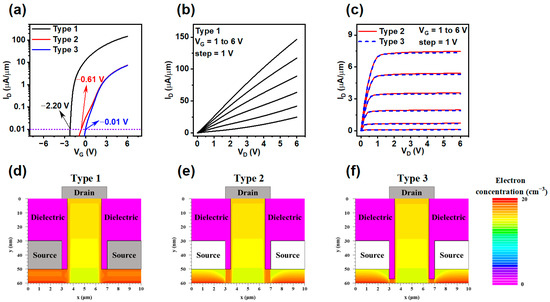 (a) Transfer characteristics of wrapping IGZO transistors. (b) Output characteristics of type 1 wrapping a-IGZO transistor. (c) Output characteristics of type 2 and type 3 wrapping a-IGZO transistor. Electron concentration plots of (d) type 1, (e) type 2, and (f) type 3 wrapping a-IGZO transistors when VG = 6 V and VD = 6 V.