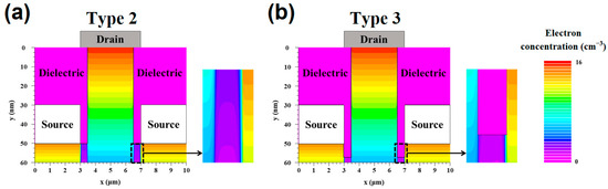 Electron concentration plots of (a) type 2 and (b) type 3 wrapping a-IGZO transistors when VG = −1 V.