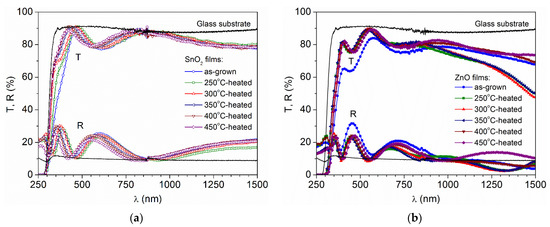 Transmittance and reflectance spectra corresponding to the as-grown and heating conditions for the two sputtered metal oxides: (a) SnO2 and (b) ZnO. Spectra for a bare glass substrate are included for comparison.