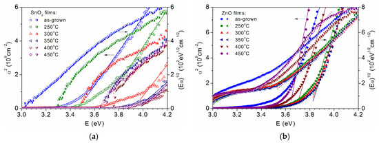 Equations (6) and (7) have been applied to the optical absorption data, as shown for the SnO2 films in Figure 5a and for the ZnO layers in Figure 5b. The linear fit of α2 vs. E gives values in the range Edir = 3.47–3.96 eV for SnO2 and Edir = 3.60–3.81 eV for ZnO, while the linear fit of (Eα)1/2 vs. E results in ETauc = 3.00–3.63 eV for SnO2 and ETauc = 3.14–3.34 eV for ZnO, as summarized in Table 2. Due to the band gap widening observed for SnO2 above 300 °C, the linear fit to obtain Edir is based on fewer points, with regression coefficients (R2 ~ 0.85) somewhat lower than for the rest (R2 > 0.95). For each sample, Edir > ETauc because the corresponding plots highlight the optical absorption occurring in different energy regions (high or low, respectively). Here, the same relationship (Edir − ETauc) = (0.45 ± 0.05) eV is observed for both materials, although the crystallite size changes. In fact, a comparison of the data in Table 1 and Table 2 indicates that the free carrier concentration plays a more important role than the crystallite size in determining the band gap energy of these materials, as discussed in Section 3.5. The direct band gap energies for bulk crystalline SnO2 and ZnO are 3.6 eV and 3.4 eV, respectively [33]. For polycrystalline films, the structural disorder can give somewhat lower direct gap energies, typically above 3.4 eV for SnO2 [36,37] and above 3.3 eV for ZnO [38,39], while the increase in carrier concentration can result in transition energies above that of the bulk crystalline semiconductor [39]. Otherwise, Tauc energies below 3.0 eV are reported for amorphous SnO2 [40,41]. Therefore, the results shown in Figure 5 are in agreement with the literature.