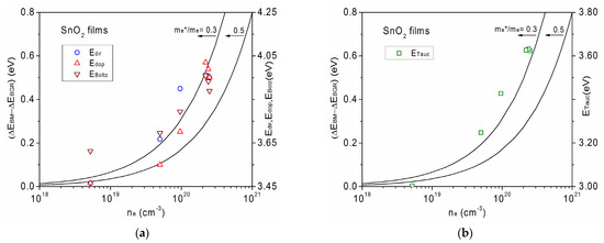 The gap values obtained in the previous subsections (Edir, ETauc, Edop, and EBoltz) are plotted as a function of the respective carrier concentration for the SnO2 films in Figure 9 and for the ZnO layers in Figure 10. The evolution of these data will now be analyzed according to the gap widening due to the Burstein–Moss shift, which can be expressed by [44]: