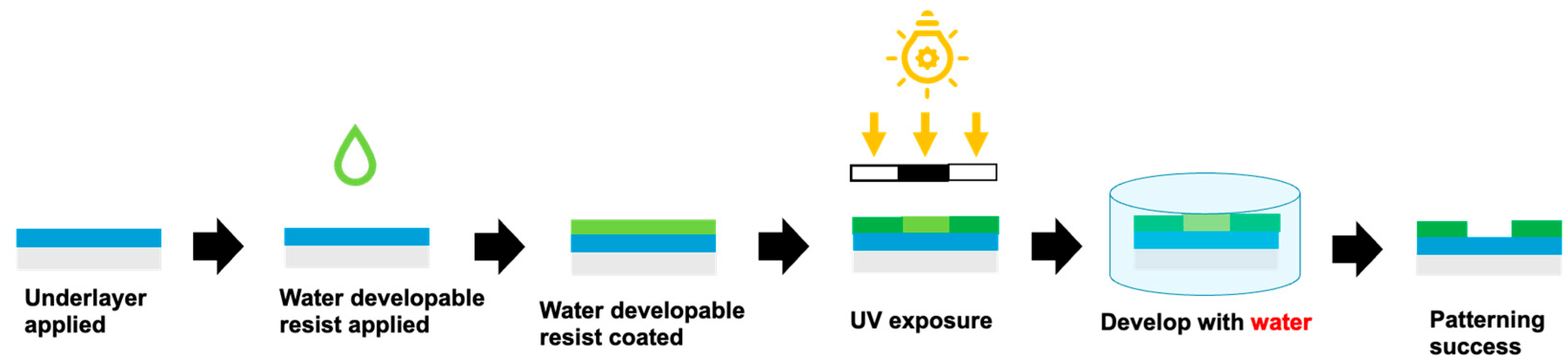 - Havard, J.M.; Shim, S.Y.; Fréchet, J.M.; Lin, Q.; Medeiros, D.R.; Willson, C.G.; Byers, J.D. Design of photoresists with reduced environmental impact. 1. Water-soluble resists based on photo-cross-linking of poly (vinyl alcohol). Chem. Mater. 1999, 11, 719–725. [Google Scholar] [CrossRef]