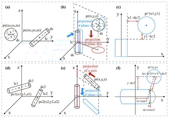 (3) Project the geometries onto the x-y plane. Define the plane containing the cylinder axis and the sphere’s center as the sc plane, and project the geometries onto this plane. Referring to Figure 2c, if the shapes overlap, no collision occurs.