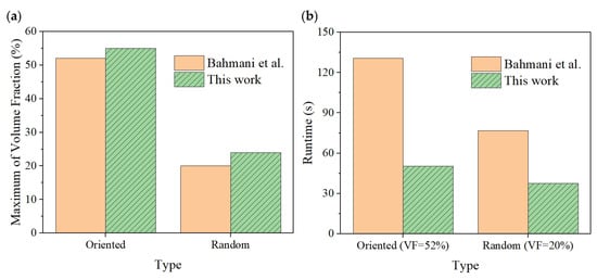 In the multi-fillers model, the fillers whose shapes were a rod or piece were used frequently. Both of them can be simulated to a cylinder in the RVE because of the sharp aspect ratio. More flexible algorithms that are suitable for irregular geometry usually spend a lot of time on the crude solution. The collision detection algorithm in this work breaks down the three-dimensional collision detection into some two-dimensional collision detection by dimensionality reduction and Rodrigues transformation. By the above method, our algorithm shortens the runtime significantly. The dimensionality reduction approach is similarly applied in other collision detection algorithms. As in Bahmani [], the algorithm projects the cylinder onto the x-y, y-z, and z-x planes. The core challenge lies in detecting collisions between sub-figures after projection. The proposed algorithm exhibits an obvious advantage in efficiency compared with existing techniques with a similar solution []. Referring to Figure 3, the maximum volume fraction was increased. Compared with the work of Bahmani et al., the change in the dimension reduction strategy of the collision detection algorithm in this paper has improved the efficiency of the algorithm. In the oriented case, the maximum volume fraction increased from 52 vol% to 55 vol%; in the random case, the maximum volume fraction increased from 20 vol% to 24 vol%, an increase of 5.8% and 16.7%, respectively. Reducing the random process greatly improved the efficiency of the algorithm, saving a considerable amount of computing time. When the filler was oriented and the volume fraction was 52 vol%, the running time decreased from 131 s to 50 s. When the filler was random and the volume fraction was 20 vol%, the running time decreased from 78 s to 37 s.