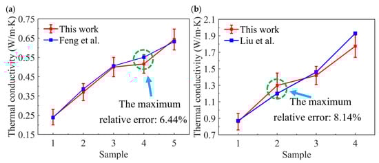 Two sets of validation experiments were conducted using different filler combinations which encompass all filler types utilized in the model. By comparing the calculated results with the experimental data in Figure 5, the maximum errors that are highlighted by a green circle were found to be 6.44% and 8.14%, respectively. Regarding the errors, on the one hand, it could be that there are errors in the experimental measurements; on the other hand, it could be that the orientation of the model used in the simulation differs from the actual orientation of the filler. The consistent agreement between the two sets of validation results collectively demonstrates the reliability of the multi-dimensional filler packing model in simulating the thermal conductivity of the composites.