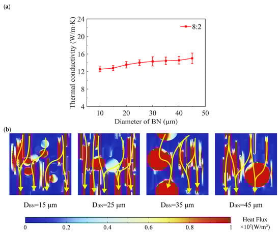 The thermal pathway theory, widely recognized as the predominant mechanism governing heat conduction in filler-reinforced TIMs, points out that heat primarily propagates along low-thermal-resistance pathways formed by interconnected filler networks, flowing from high- to low-temperature regions. Among the various factors influencing the quality of these thermal pathways, filler size is also a critical parameter. This section focuses on investigating the effect of BN particle diameter on thermal conductivity through simulations of CF-BN binary models with varying BN diameters. The simulation results demonstrate a positive correlation between thermal conductivity and diameter, as illustrated in Figure 8.
