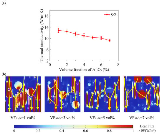 The results (Figure 9a) demonstrate that the ternary composites achieves maximum thermal conductivity (13.72 W/m∙K) in the absence of Al2O3 filler, as shown in Figure 6a. The thermal conductivity exhibits a decreasing trend with increasing Al2O3 volume fraction, showing an average reduction rate of 0.60 W/m∙K per 1 vol% Al2O3 addition. Moreover, this decreasing trend remains largely unchanged with higher loadings. Combined with the previous analysis, it can be preliminarily concluded that fillers with high aspect ratios are more effective in constructing efficient thermal pathways. The Al2O3 is isotropic material, and this property enables it to have a certain heat-conducting ability in all directions. However, during the heat-conduction process, the role of the heat-conducting path is to transfer heat from the hot end to the cold end. Materials with a high aspect ratio are more likely to form such a path, so alumina plays a relatively smaller role in constructing the thermal pathway. As the sphere volume fraction increases, the proportion of thermal resistance caused by heat flux penetrating the matrix also increases, degrading the overall quality of the thermal pathways. The y-z plane heat flux analysis (according to Figure 9b) demonstrates that spherical filler carries significantly less heat flux compared to BN and CF, approximately 0.3 × 107 W/m2, and with small variation as its volume fraction increases. This indicates that its contribution to the thermal pathway of Al2O3 within the pathways is less than that of BN and CF. The research findings demonstrate that, while the morphology of the sphere facilitates excellent dispersion within the composite matrix, it simultaneously decreases its capability to construct efficient thermal pathways in filler-reinforced composites. This finding significantly elevates the importance of filler morphology in optimizing thermal pathway architecture and enhancing the overall performance of composites.