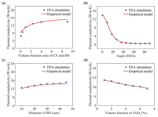 The fitting result (a) BN/CF volume fraction ratio, (b) orientation angle, (c) BN diameter, and (d) Al2O3 volume fraction.