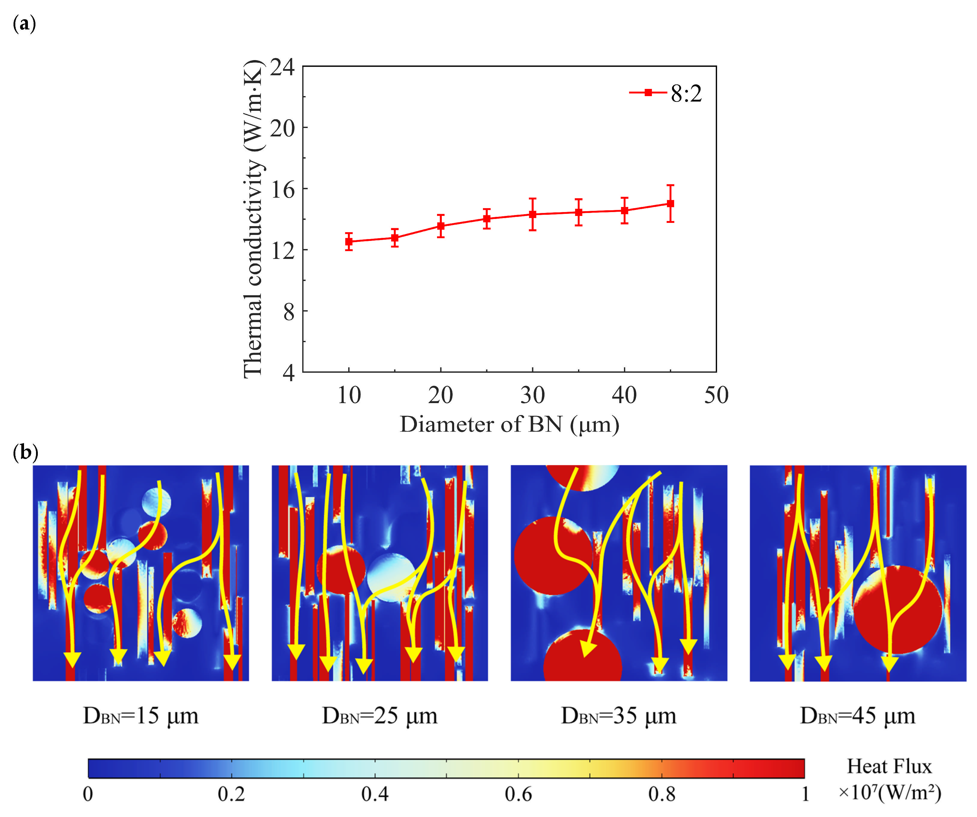 - As the diameter of BN increases, the thermal conductivity gradually increases, but the rate of increase is small. The diameter of BN affects the synergistic effect between CF and BN, with larger diameters of BN being more beneficial for the construction of thermal pathways.