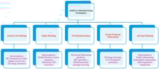 Additive Manufacturing (AM) and printing-based fabrication technologies have emerged as transformative tools capable of addressing many of these limitations [19,20,21,22]. Unlike conventional manufacturing, AM enables the direct, maskless and digitally controlled deposition of functional materials including conductive, dielectrics, and structural polymers onto planar and nonplanar substrates. There are total of seven types of AM techniques, [23] but in this article we discussed five printing technologies, such as aerosol jet printing [2,24], inkjet printing [25,26], vat polymerization [27,28], fused filament fabrication (FFF), also called fused deposition modeling (FDM) [29,30] and fluid-dispensing-based nScrypt printing [31,32], as mentioned in Figure 1, which allows the fabrication of electrical interconnects, dielectric structures, and mechanical supports with a level of design freedom unattainable using traditional approaches.