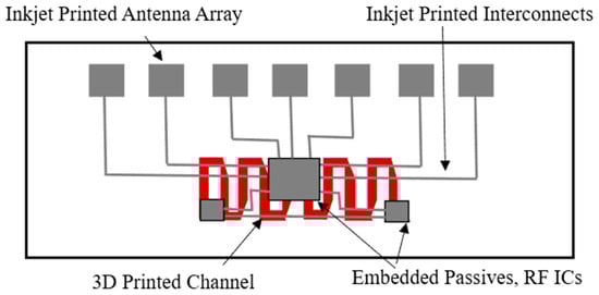 In recent years, these technologies have transitioned from simple prototyping tools to viable manufacturing platforms for printed electronics, system-on-package (SoP) architectures, embedded-chip assemblies, and smart electronic packaging. Numerous studies have demonstrated their effectiveness in fabricating printed antennas, RF transmission lines, signal crossovers, three-dimensional ramp interconnects, and embedded passive and active components (demonstration shown in Figure 2). Importantly, additive manufacturing enables heterogeneous integration by allowing materials with vastly different electrical, thermal, and mechanical properties to be combined within a single package [11,33,34,35].