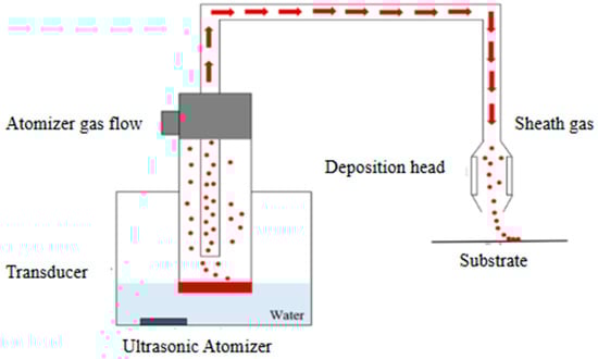 Aerosol jet printing is one of many direct-write (DW) processes. Direct-write technology refers to the creation of micro- and nanoscale, 2D or 3D structures on flat or nonconformal surfaces. The AJP process can print a variety of aerosolization-capable liquid inks such as colloidal inks, nanoparticle inks, diluted thick film paste and UV-curable polymer solutions [36]. Figure 3 shows a conceptual layout of aerosol jet printing apparatus. Liquid inks are first atomized to create a dense aerosol cloud of 1–5 µm diameter droplets. A pneumatic nebulizer is typically used when the liquid viscosity is in the range of 20–1000 cP and an ultrasonic atomizer is used for low viscosity fluids, i.e., 1–20 cP. The particle diameter is limited to below 1 µm for the pneumatic nebulizer and below 0.2 µm for the ultrasonic atomizer. Once created, a carrier gas transfers the aerosol to a printing head. This carrier gas is typically dry with nitrogen, but other gases and vapors can be introduced into the gas stream as needed. Within the printhead, a second co-flowing sheath gas focuses the droplets to a 10–100 µm diameter jet. The droplets (shown in red color in Figure 3) exit the nozzle at velocities up to 100 m/s [25,37,38].