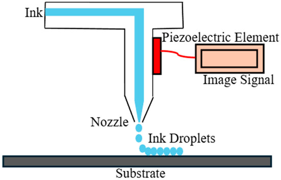 Inkjet printing is a digitally controlled material deposition technique in which picolitre-scale droplets of functional inks are selectively ejected through a micro-sized nozzle onto a substrate. Since its existence, it has become one of the most widely used printing technologies for both personal and commercial use due to the low cost, high quality, and versatility [25]. Modern inkjet printing primarily employs drop-on-demand (DoD) operation, where droplets are generated only when required. In piezoelectric inkjet systems, an applied electrical pulse deforms a piezoelectric actuator, creating a pressure wave that expels a single droplet from the nozzle [45,46,47]. Droplet formation, flight, and impact are governed by fluid dynamics, surface tension, and substrate wetting behavior. Everything is controlled through the software’s such as raster image processing (RIP) (v3.0), waveform optimization, and printhead control. The process is shown in Figure 4. The particle with the maximum diameter with the solvent is constrained by the dimensions of the inkjet nozzle, ranging from 10 to 50 µm, and necessitates the particle to be at least 25% smaller than the nozzle diameter. The processes are repeated in succession to achieve the desired pattern. After deposition, solvent evaporation and subsequent curing or sintering convert the printed pattern into a functional substrate. Inkjet printing supports precise lateral placement and enables multilayer fabrication through sequential deposition and curing steps [48].