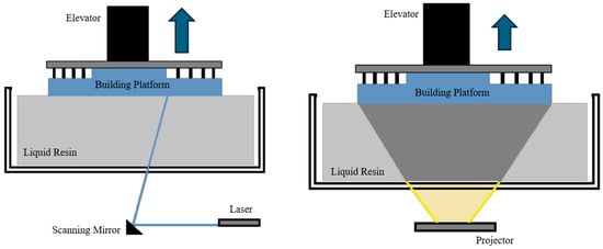 A schematic illustration of vat polymerization processes: (left) scanning-based stereolithography (SLA); (right) projection-based digital light processing (DLP).