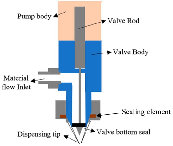 nScrypt printing is a precision micro-dispensing-based additive manufacturing technology that employs a patented SmartPump valve system to control material flow at the picolitre scale. Unlike conventional extrusion methods, the nScrypt system uses an actively actuated valve positioned near the dispensing orifice, allowing precise start-stop control of material deposition [31]. The schematic of nScrypt is shown in Figure 7, where the cross-sectional view of the valve assembly depicts a valve rod driven by a motor, traveling with a resolution of 0.1 µm within the valve body channel. The patented pen tip shape minimizes pressure requirements for material dispensing through very small holes, such as 100 microns or less. This assembly can handle highly viscous materials and loaded particles. Material is delivered from a syringe or cartridge under positive pressure into the valve chamber. When the valve opens, material is dispensed through a fine nozzle onto the substrate. Closing the valve induces a slight reverse flow, preventing droplet formation and stringing. This system enables high-speed printing with exceptional positional accuracy in the X, Y, and Z directions. Printing patterns can be generated by CAD software and transferred into script files using nScrypt software called nStudio (version 2021). Higher speeds enable rapid manufacturing, reducing costs, and maintenance [32,81,82].
